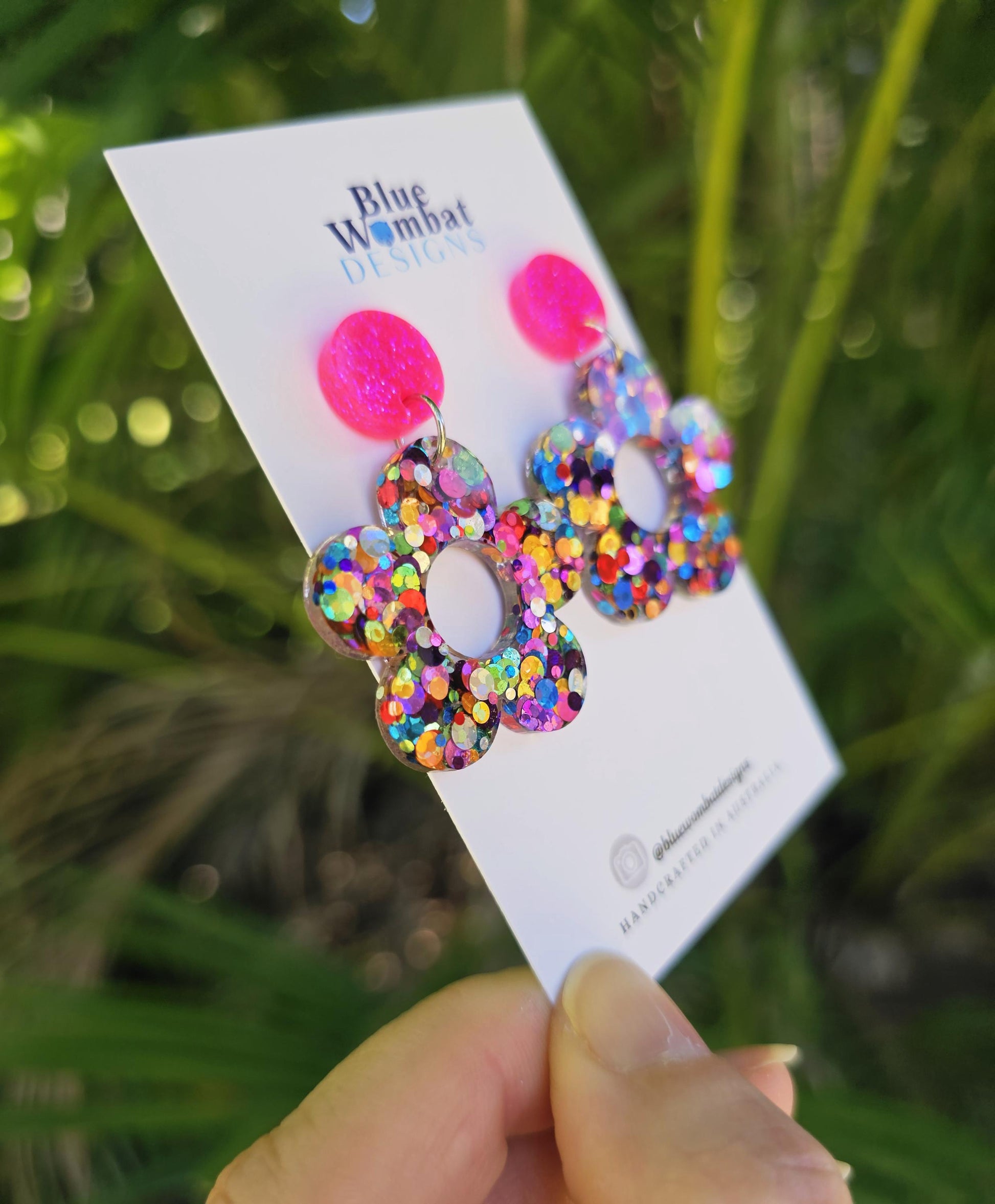 Hello lovely this pair of resin glitter flower dangle earrings have been hand poured and crafted especially for you♡